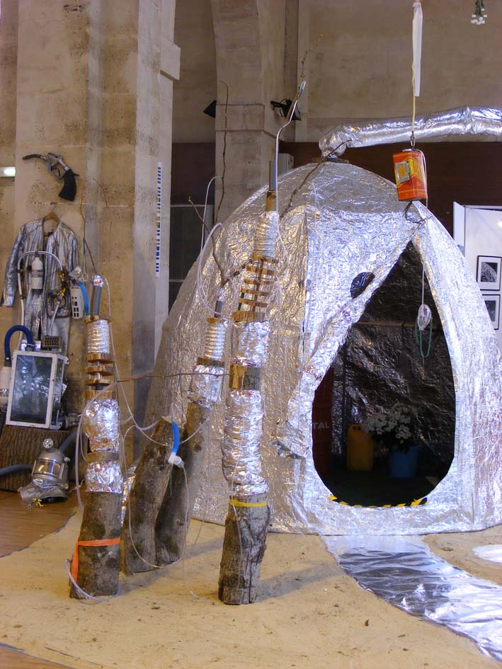 Dion Laurent's ongoing series of Emergency Shelter/Studio Projects are self-contained, self sustaining bio-environment, solar, wind, and geo-thermal emergency shelter projects, serving also as the artist's home and studios for his related EarthMan1 and EarthMan 2 performances and projects.. This Emergency Shelter Studio Project series has developed and been exhibited internationally and widely viewed in Europe, the US and via the internet. The Shelter Project(2002 - 2003) has been reviewed on Furtherfield.org, and all installations and related EarthMan performances have been widely promoted on furtherfield.org(London), rhizome.org(New Museum,NY,NY), and by numerous international art blogs and news media since 2003. These shelter projects are based on the US government and Cold War era Emergency Shelter initiatives. 2003 London Review